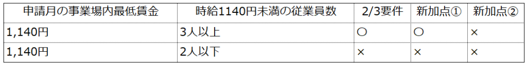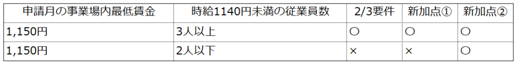 先ほどと同様に、指定期間の間に時給1140円未満で雇用している従業員が3人以上いる場合は補助率が2/3になり、それと同時に新加点①の取得が可能になります。