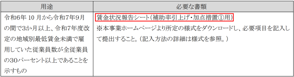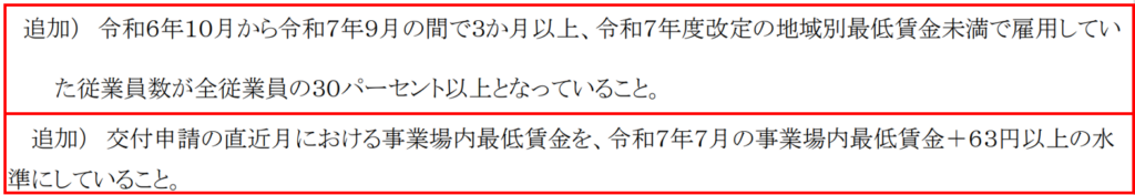 「令和6年10月から令和7年9月の間で3か月以上、令和7年度改定の地域別最低賃金未満で雇用していた従業員数が全従業員の30%以上であることを示した場合」に変更されました。