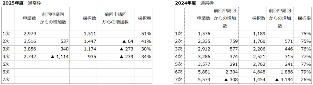 2024年度の採択率が95%前後と非常に高かったことから、2025年度は申請が増加したと想定されます。特に1次締切では前年の約4倍となる6,446件まで増加しました。