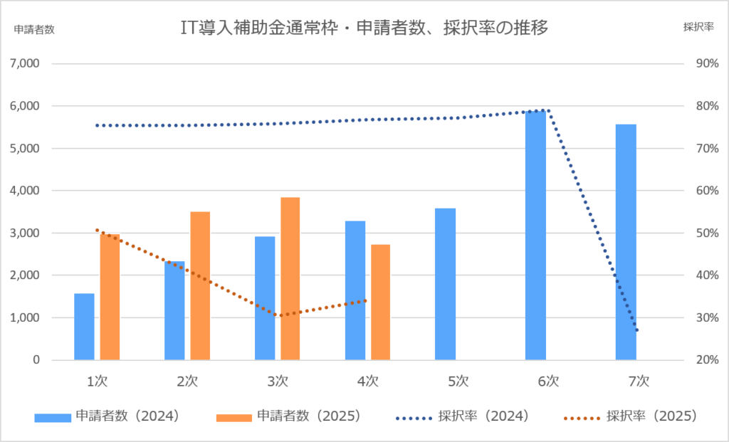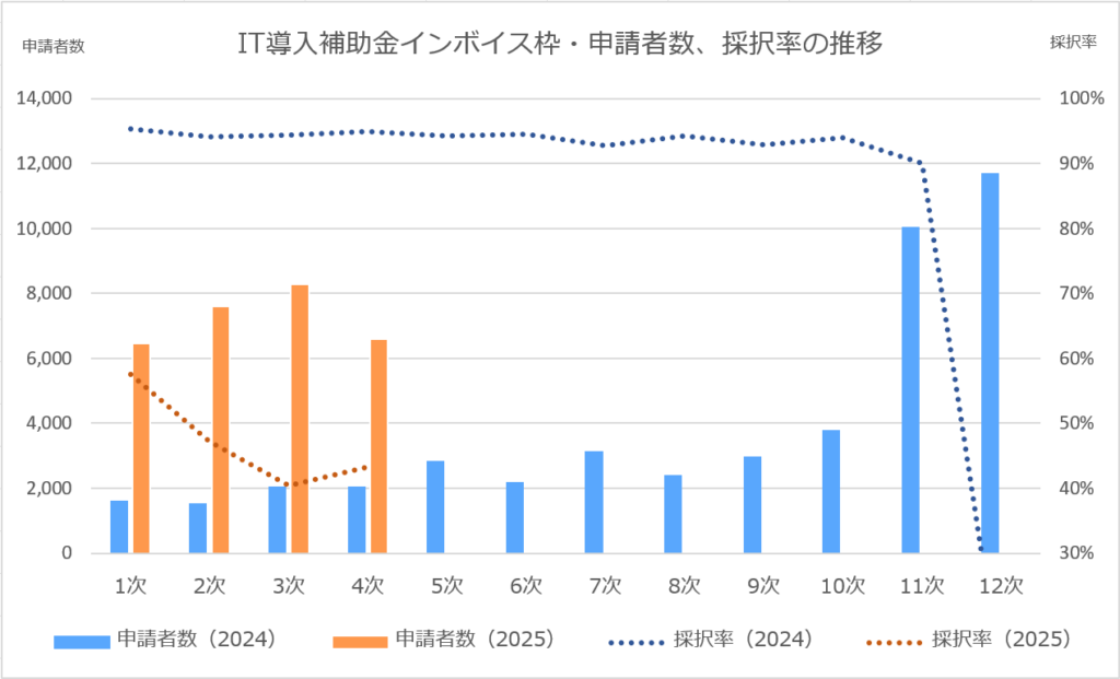 IT導入補助金2025は4次締切までしか結果が出ていないため、IT導入補助金2024との比較データの量に差が生じています。