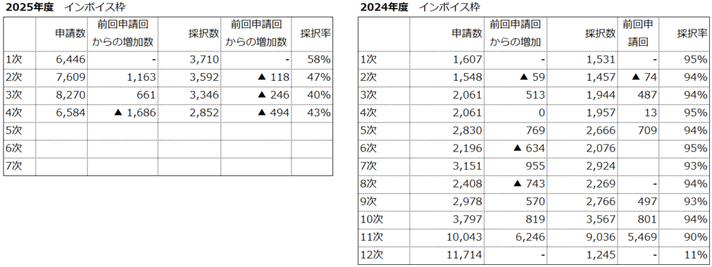 今回の4次締切は両枠共に前回の3次締切からの申請者数の減少が見られますが、インボイス枠に関しては昨年度を上回る申請者数となっています。そのような状況下で採択倍率が厳しいのもありますが、採択数自体が減らされている状況です。