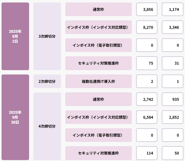 先ほど同様にIT導入補助金2025インボイス枠の結果とIT導入補助金2025インボイス枠の現在の結果をまとめたものです。