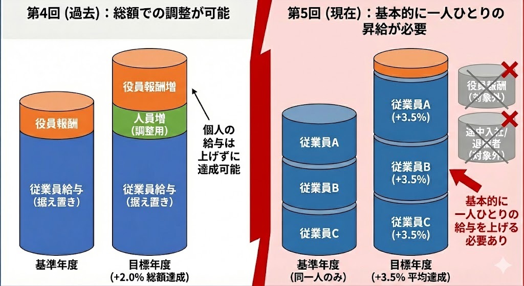 第4回の「給与支給総額+2.0%」と第5回の「1人当たり+3.5%」は母数が異なるため、単純に「1.5%上がって厳しくなった」とは言い切れません。